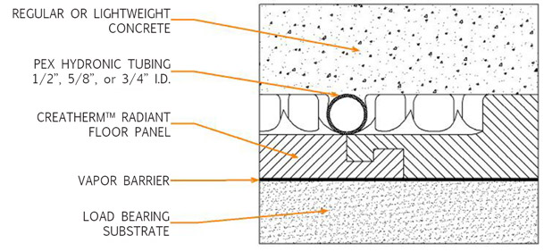 Our Radiant Floor Panels are manufactured out of Expanded Polystyrene and Neopor EPS to offer superior strength and insulating properties. Expanded Polystyrene provides excellent thermal insulation capacity, high compressive strength, outstanding impact absorption and low weight. Foam is an eco-friendly building material and is incredibly strong, quiet, virtually allergen free and is not a food source for insects or mold. Creatherm radiant floor panels offer a great solution for slab-on-grade, snow melt, retro-fit heating.